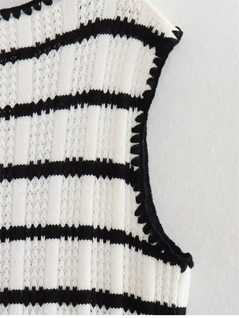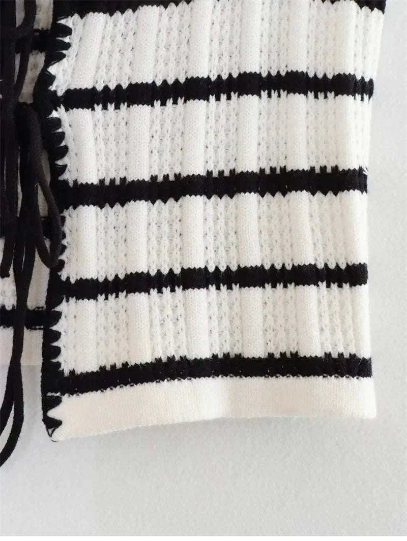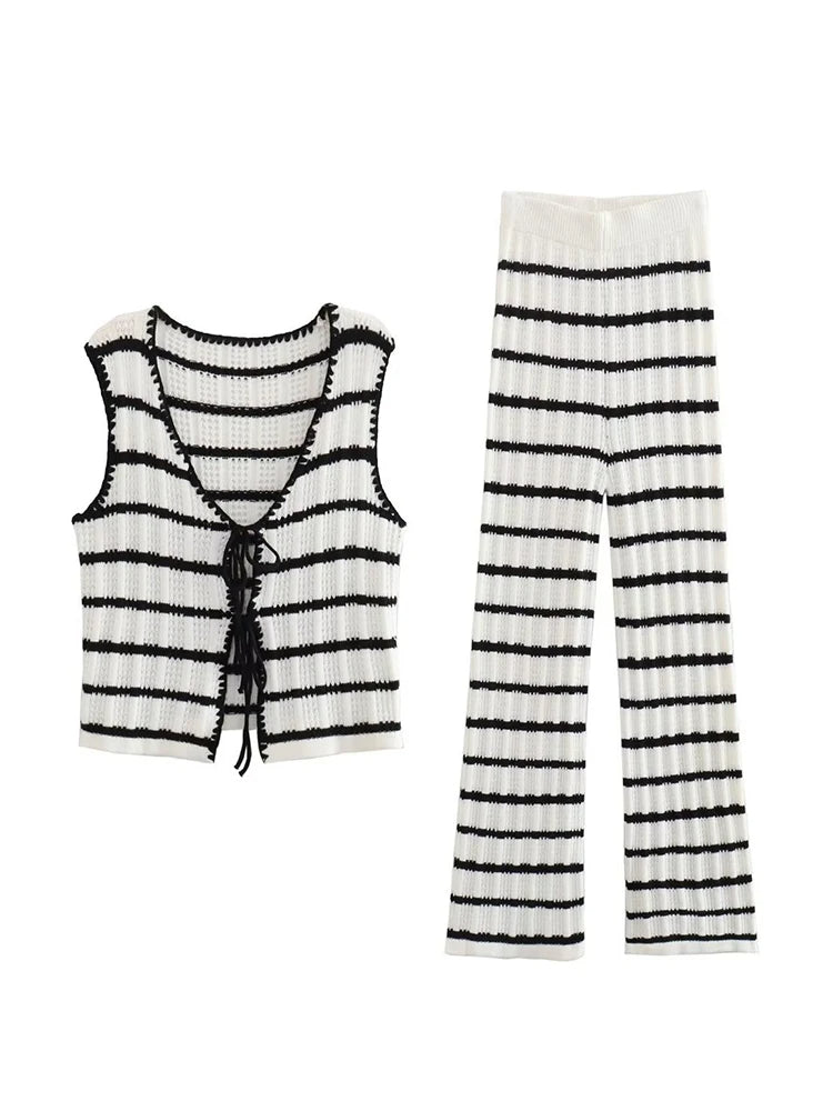 Dette elegante ensemblet består av en ermeløs topp med en leken knytdetalj foran, kombinert med bukser med vide ben. Begge plaggene er prydet med dristige, svarte striper mot et rent, hvitt bakteppe, noe som skaper en slående kontrast. Perfekt for den moderne kvinnen som setter pris på komfort uten å gå på kompromiss med stilen.